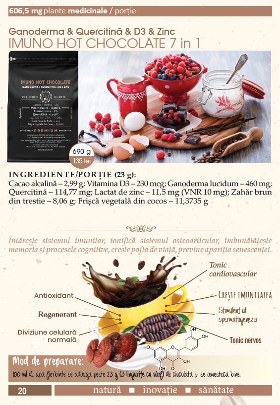 Hot Chocolate 7in1 cu Ganoderma & Quercitinã & D3 & Zinc – 690g – veg (30 de portii)